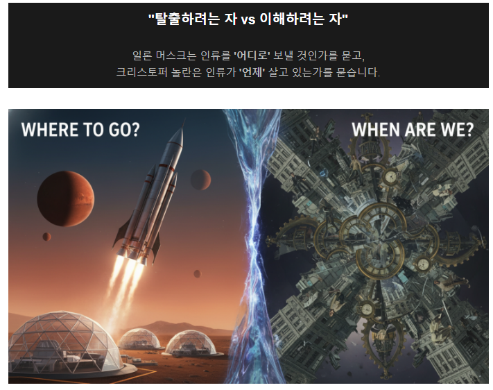 | 구분 | 일론 머스크 (Space) | 크리스토퍼 놀란 (Time) |